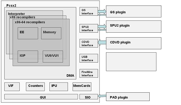 The major components of Pcsx2 are shown in the figure. The heart of Pcsx2 is the dynamic translators of the various PS2 instruction sets, most often called the recompilers. Note that there are three hearts that Pcsx2 can be compiled with depending on your CPU: the interpreter (actually always present), x86, and x86-64. Starting with 0.9.3, Pcsx2 has been retrofitted to compile the interpreter on any little-endian CPU architecture by compiling with the PCSX2_NORECBUILD define. There is also the memory management scheme that factors into dynamic translation since memory accesses can be optimized away instead of calling one huge MemoryRead(address, value) that redirects execution to the various hardware components. The DMA connects all data that is passed to the sub-components of Pcsx2. To the right are the components that are just interface stubs that interact with the plugins. At the bottom are the components that are implemented in Pcsx2 without any plugins. The reason for no plugins is that these components require tight synchronization between the Pcsx2 hardware registers, so having the component in a plugin will unnecessarily complicate and slow down things. Note that IPU can be argued to be a plugin on its own, however the actual MPEG2 decoding part of IPU is not the problem as much as the DMA communication between it and the EE.