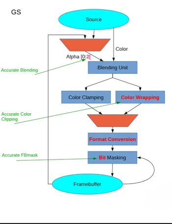 The standard GPU blending unit allows masking the shader output only channel by channel. The problem is that as the image shows, the GS can do it bit by bit. Yes, that means it's possible to write only the most significant bit of the channel on the GS. Again this issue can be solved by using a shader to emulate this feature instead of doing it on the fixed function unit of the GPU. Accurate frame buffer mask is just a feature for handling bit masking instead of channel masking. It's important to note that the new features which use shaders in place of the fixed function unit do so at the expense of some speed. High end machines should have no problems, but people with weaker machines may experience some slowdown when using a lot of the accurate options.